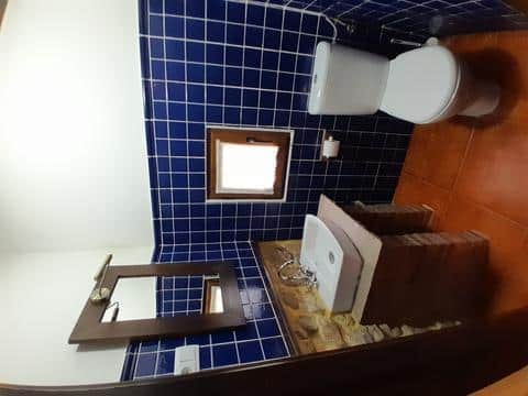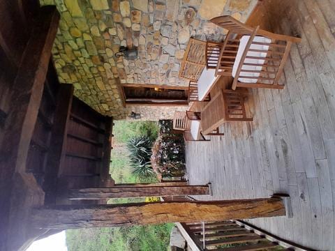 En la planta baja cuenta con la cocina (totalmente equipada), un pequeño salón con chimenea y un baño completo. En la planta de arriba están las 2 habitaciones que posee. Las dos disponen de baño (una con bañera de hidromasaje) y con salida a una amplia terraza con sofás y hamaca donde disfrutar del ambiente natural que rodea la cabaña. Con barbacoa.